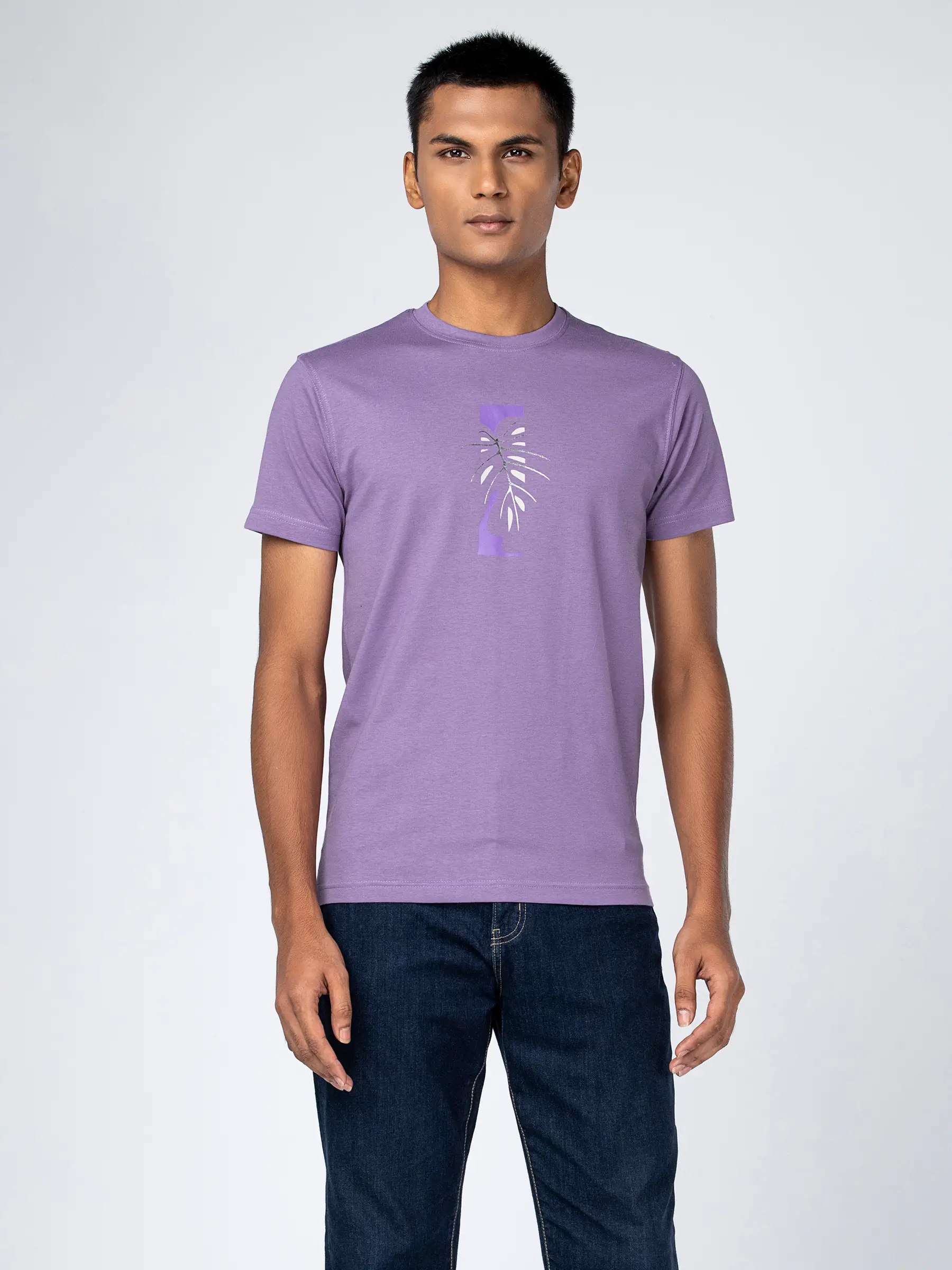 Light purple cotton t-shirt with beige and silver prints. Features rib knit round neck.