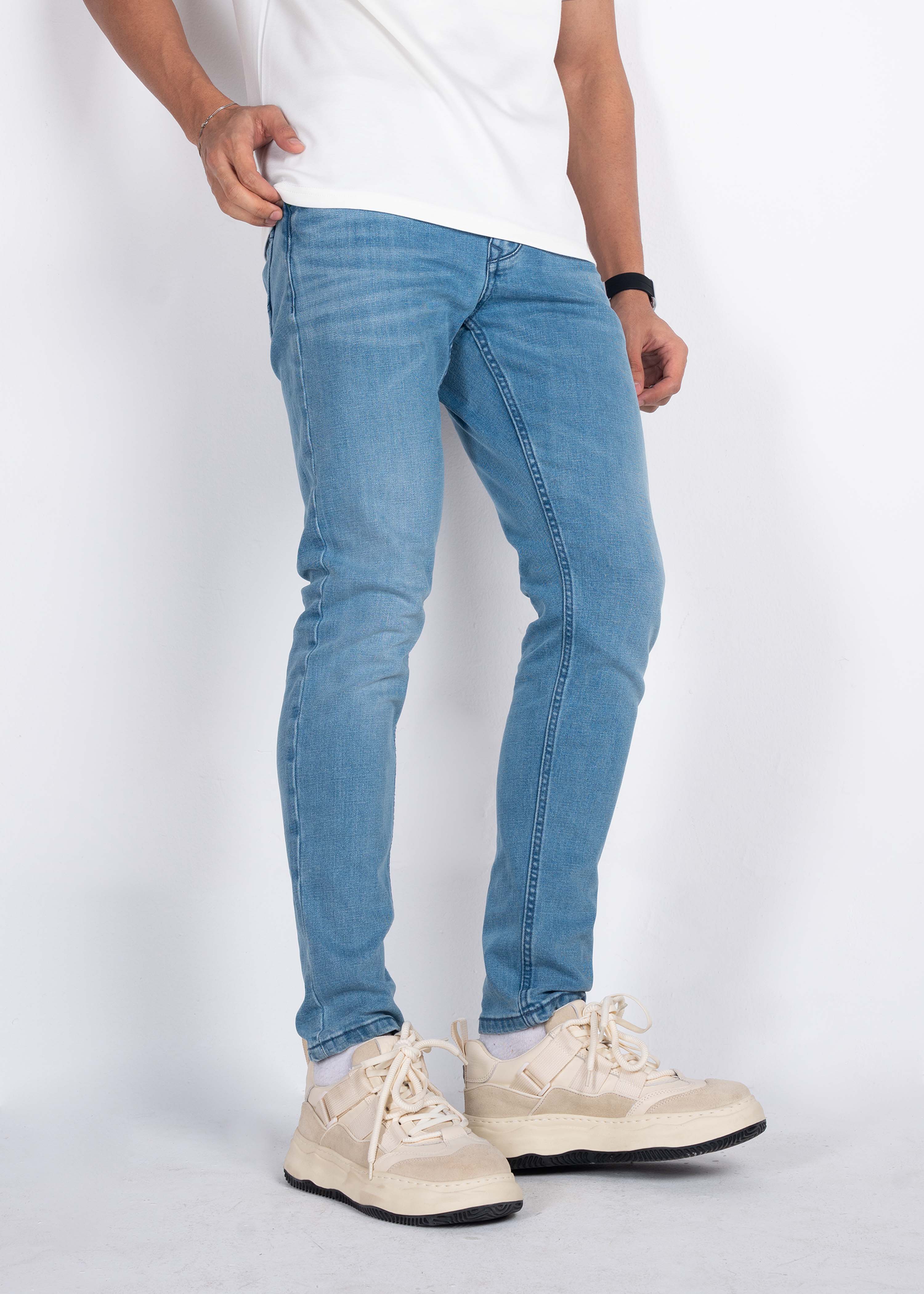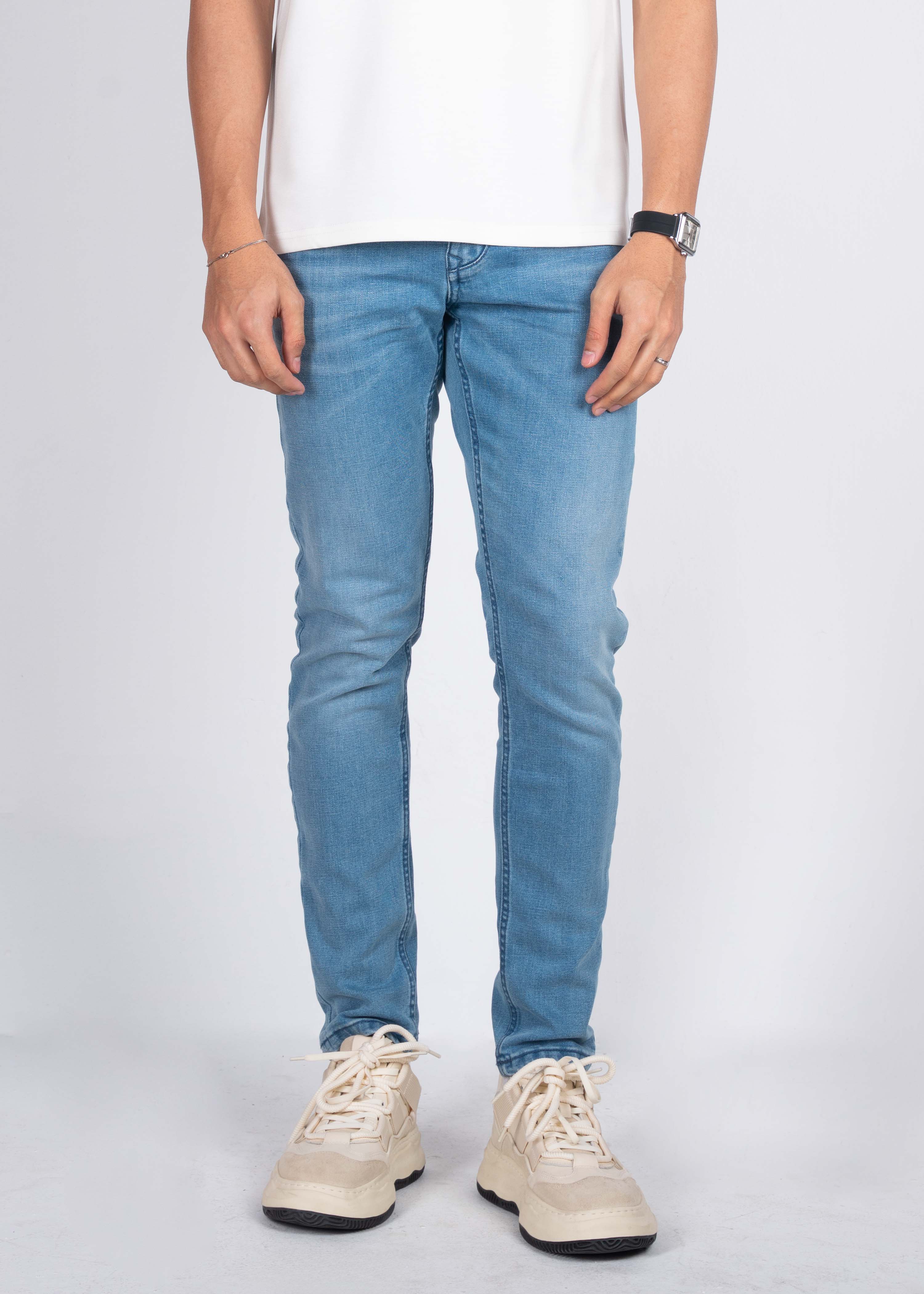 Light Indigo color slim-fit jeans. Five pockets. Faded effect. Zip fly and button fastening on the front