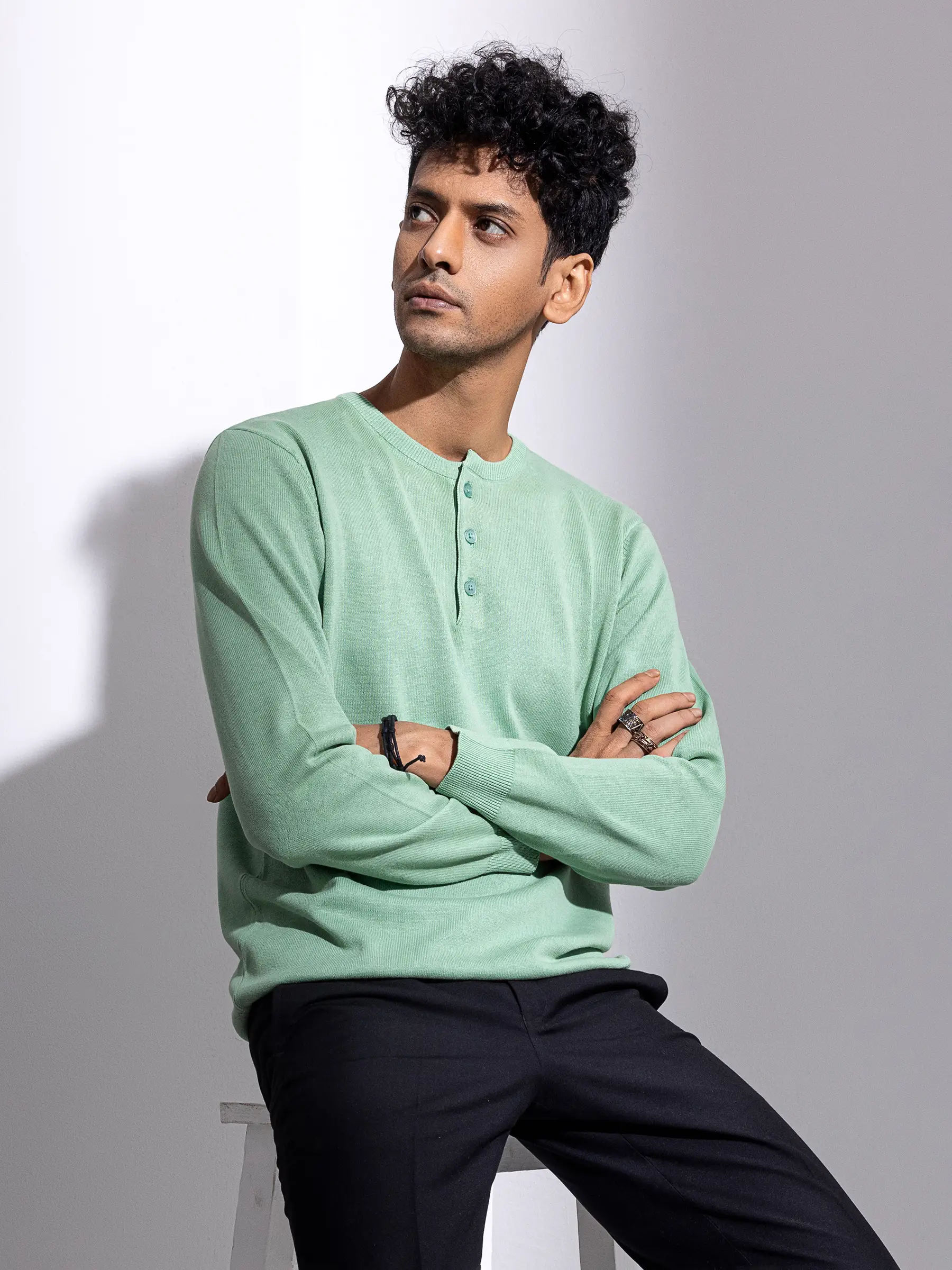 Mist green cotton Taaga Man sweater. Pair up with your winter outfit.
