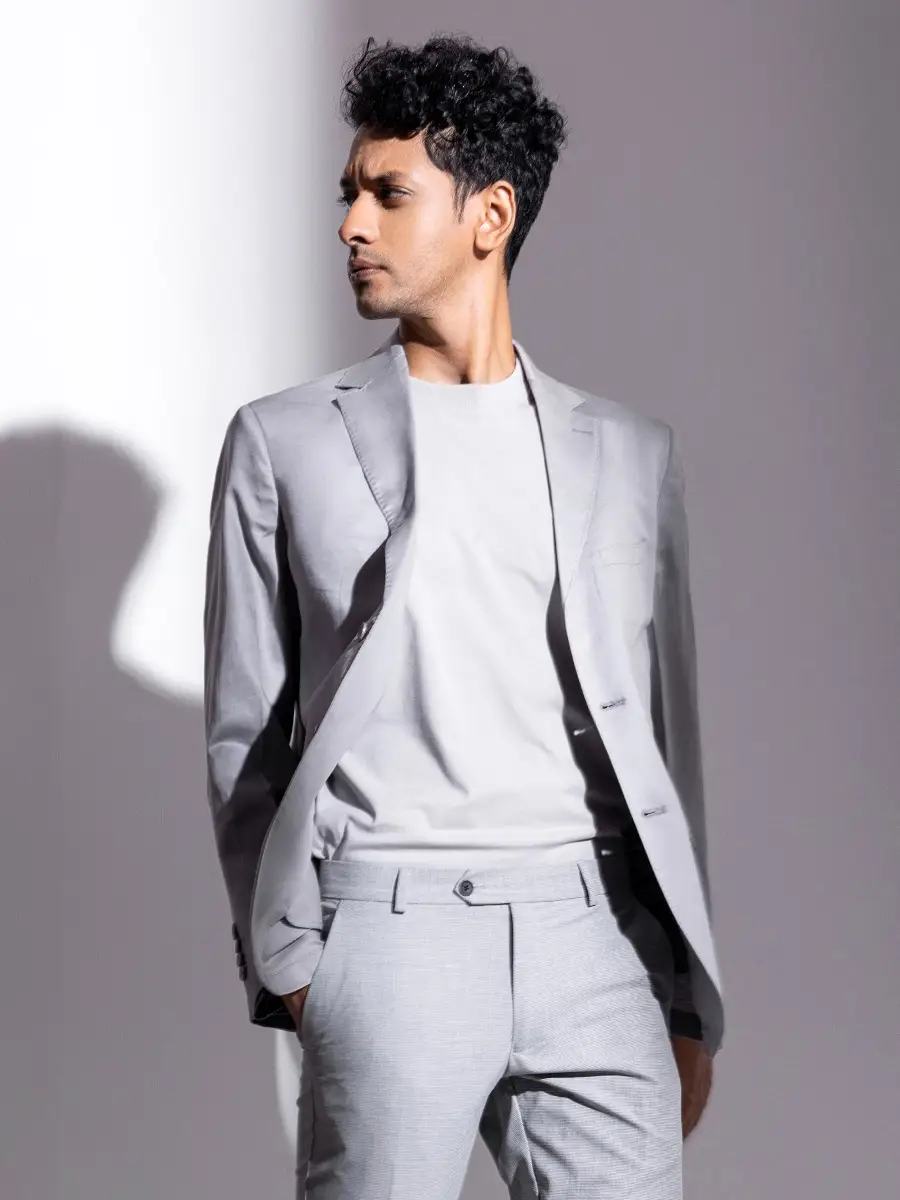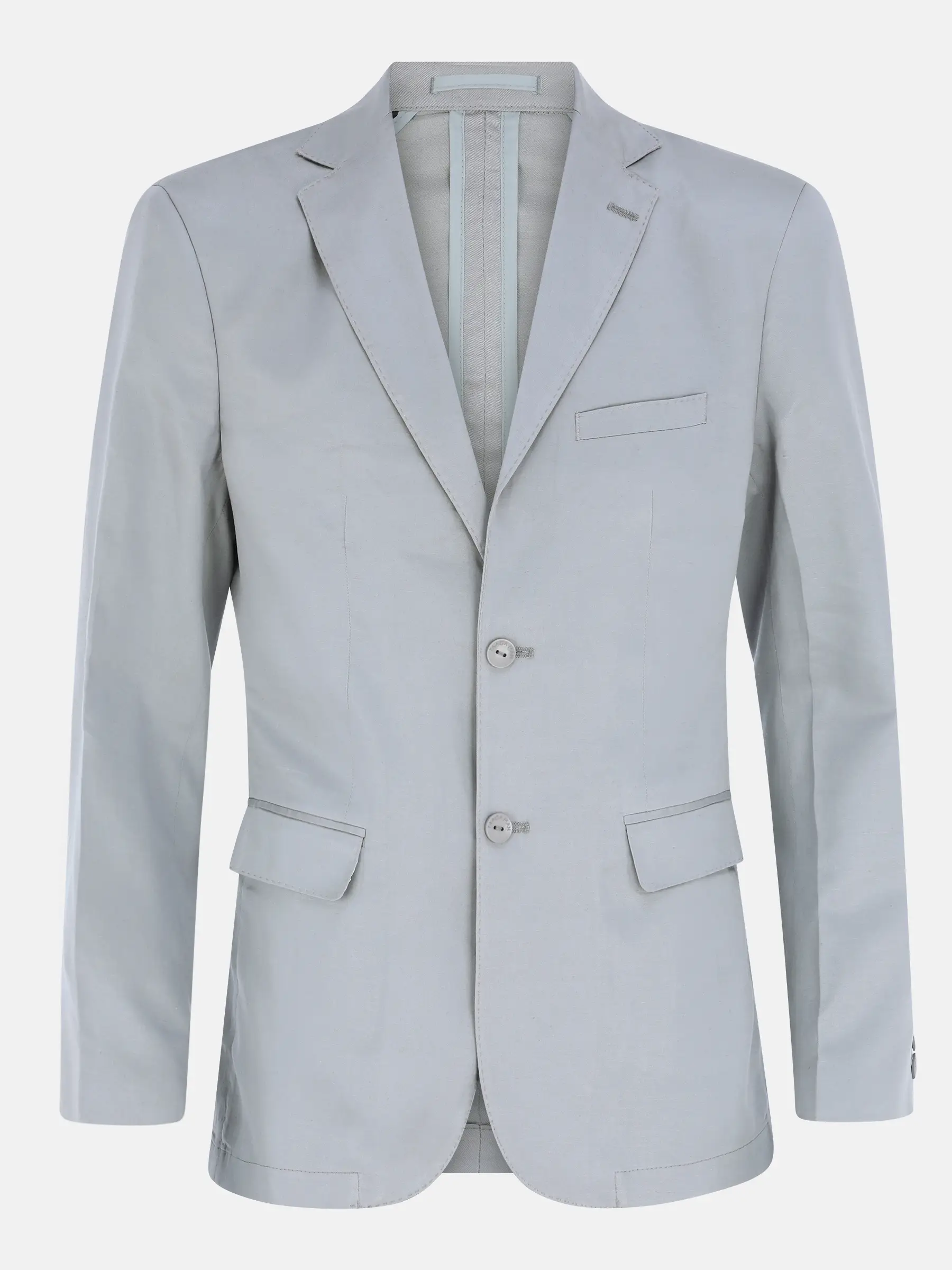 Grey textured linen two button casual blazer. Stylish blazer featuring a chest pocket, two front pockets and polyester lining for comfort and functionality