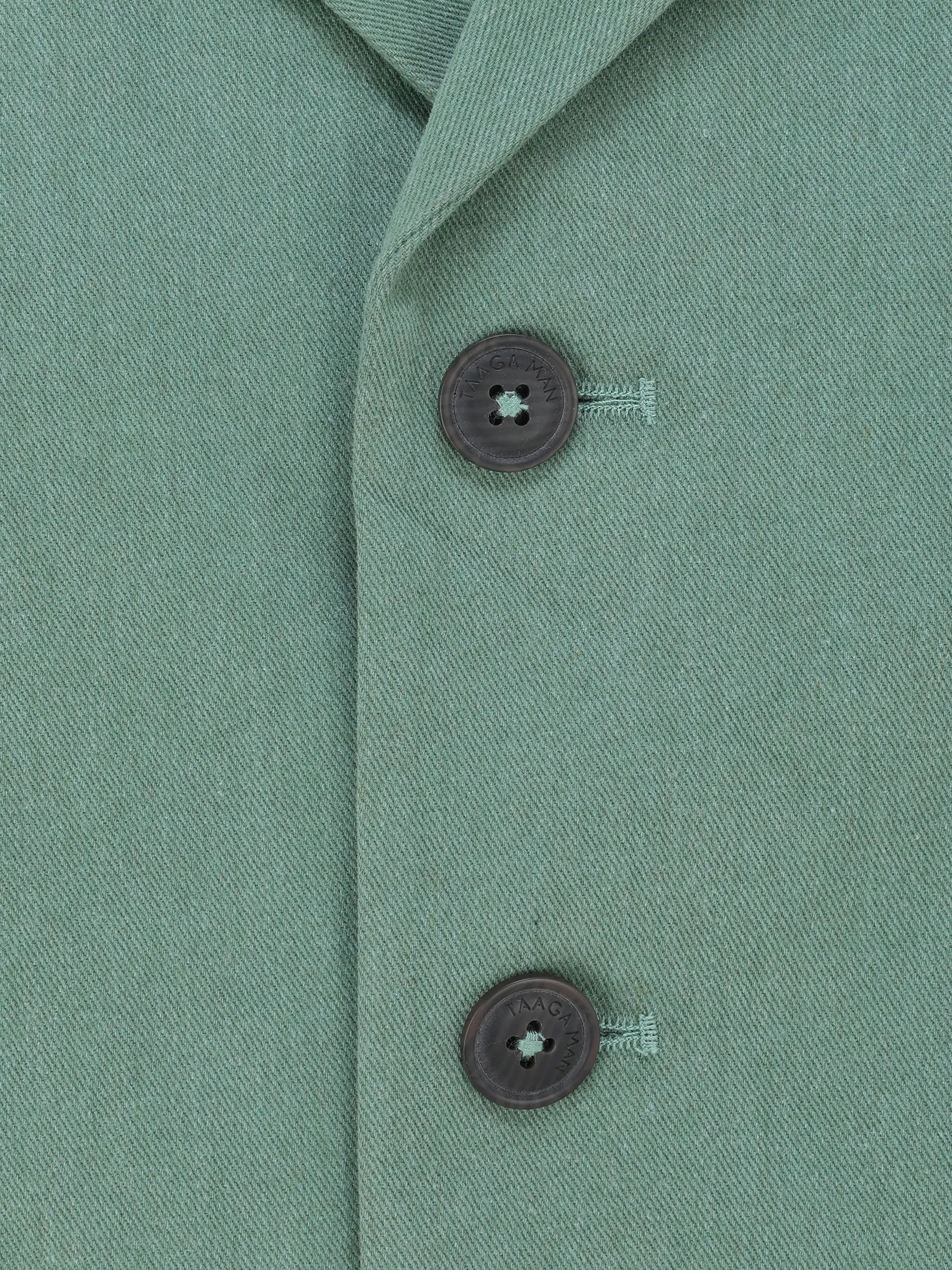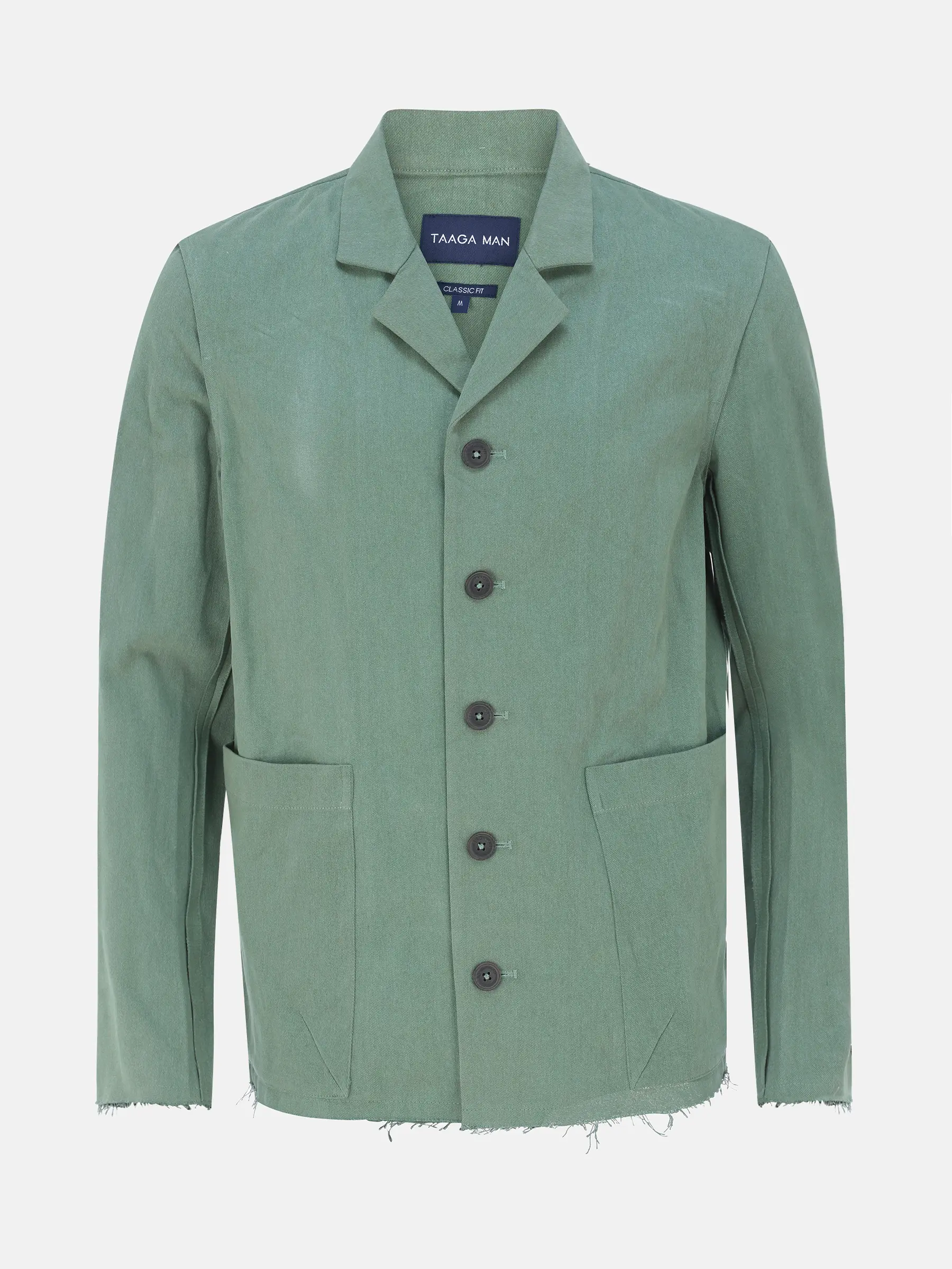 Emerald green cotton-polyester blend blazer-style Taaga Man jacket with front button closure. Two front bellows pockets.