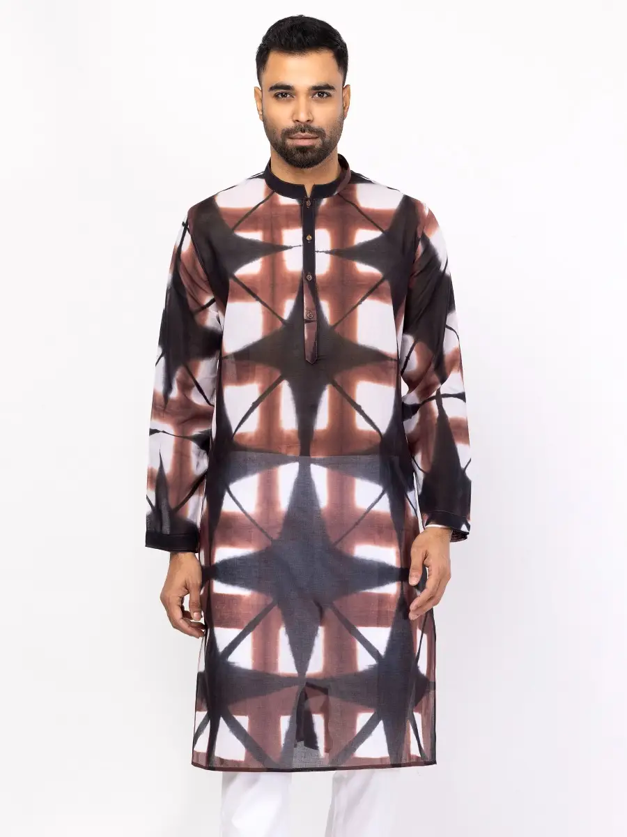 White, brown and black tie-dyed addi cotton panjabi. Features in-seam side pockets.