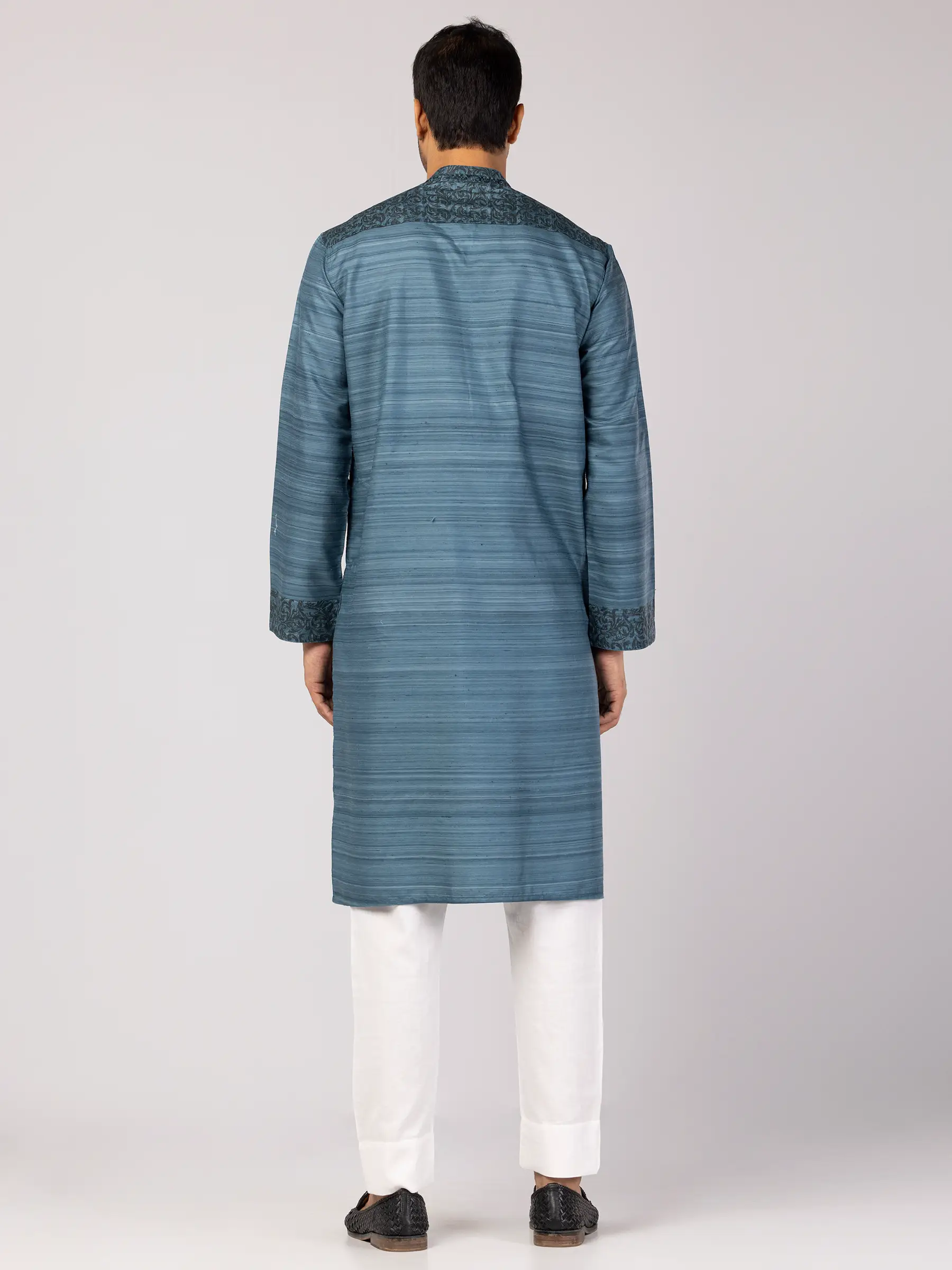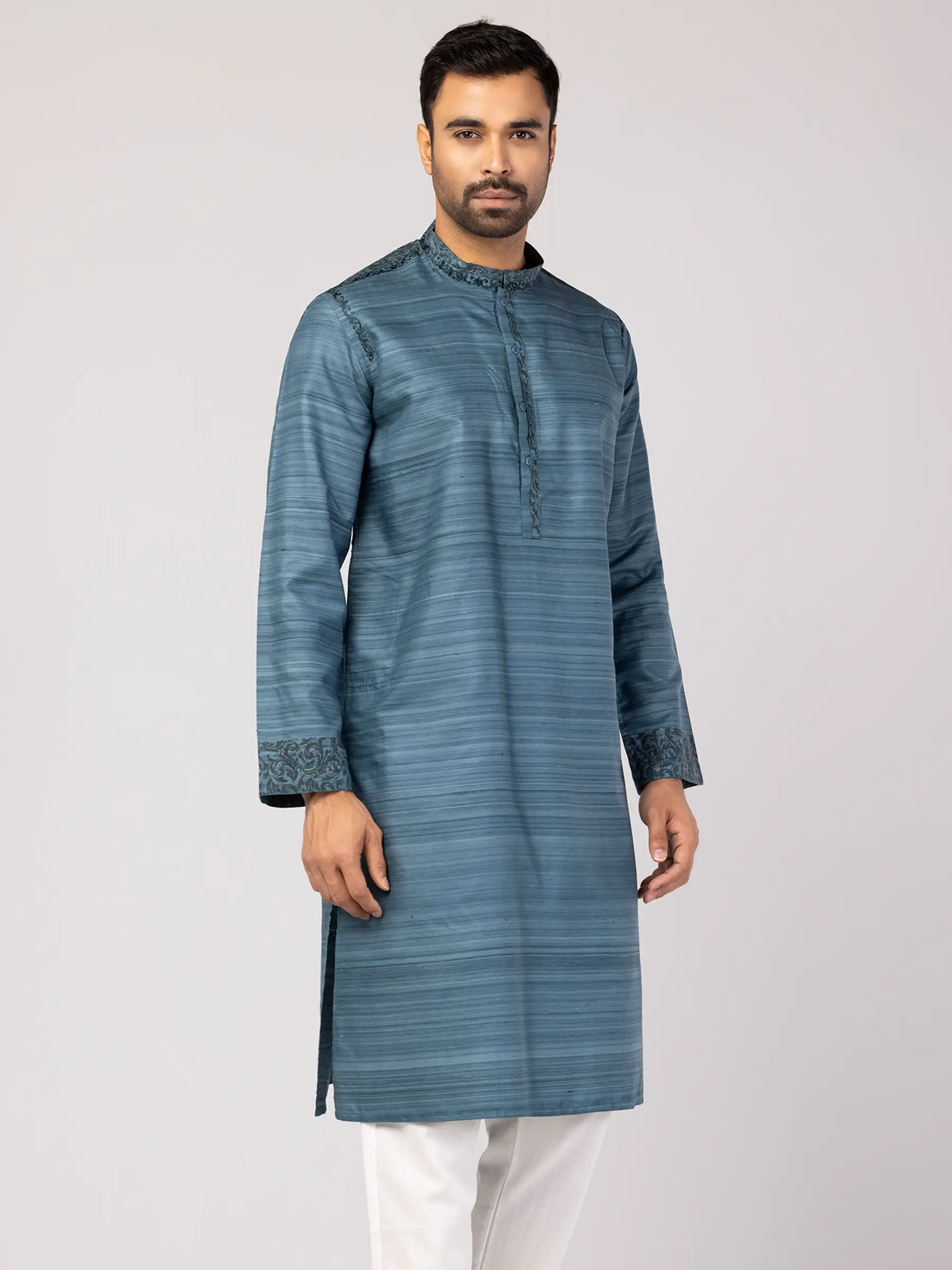 Teal Blue Printed and Embroidered Endi Silk Panjabi