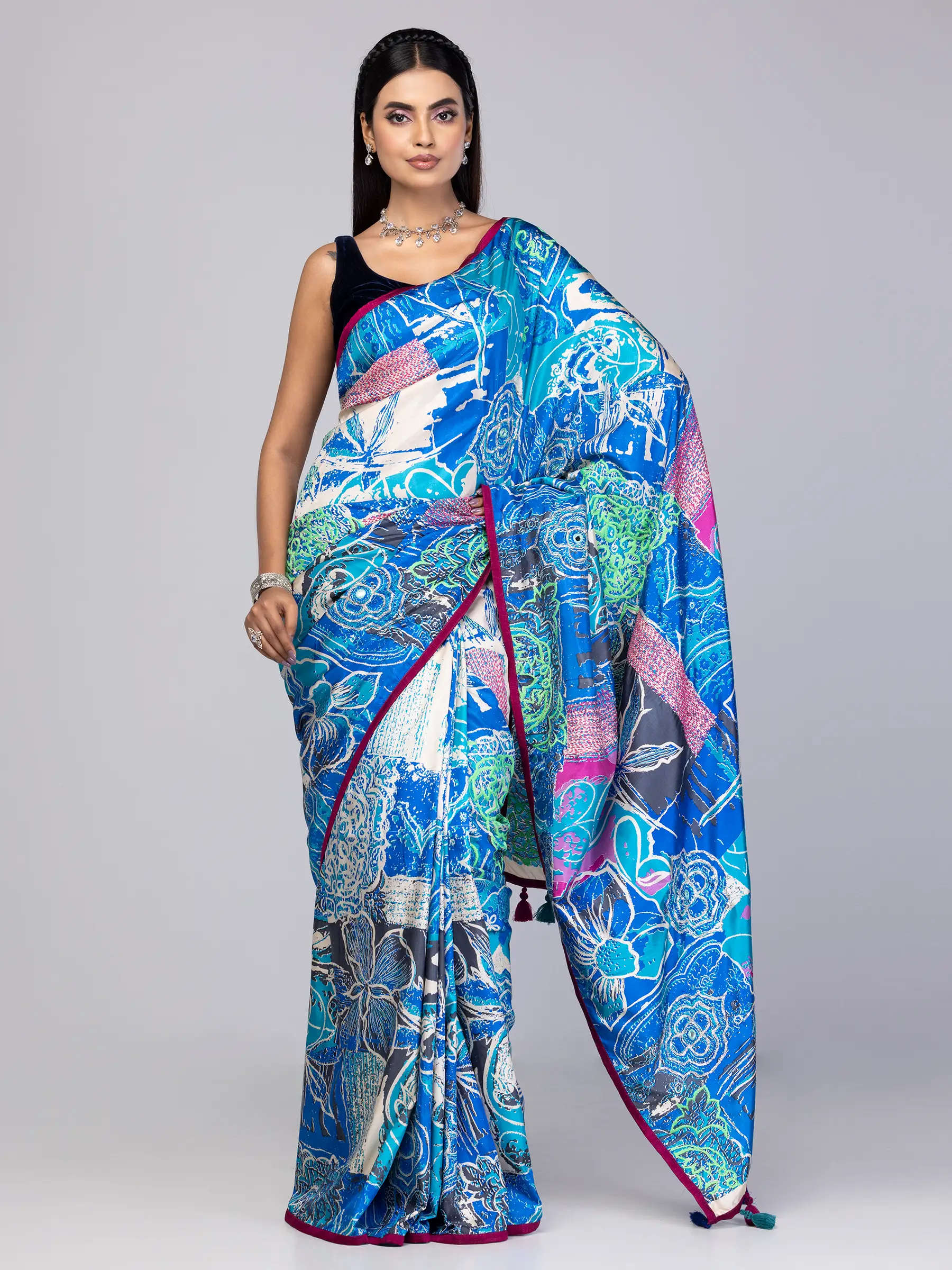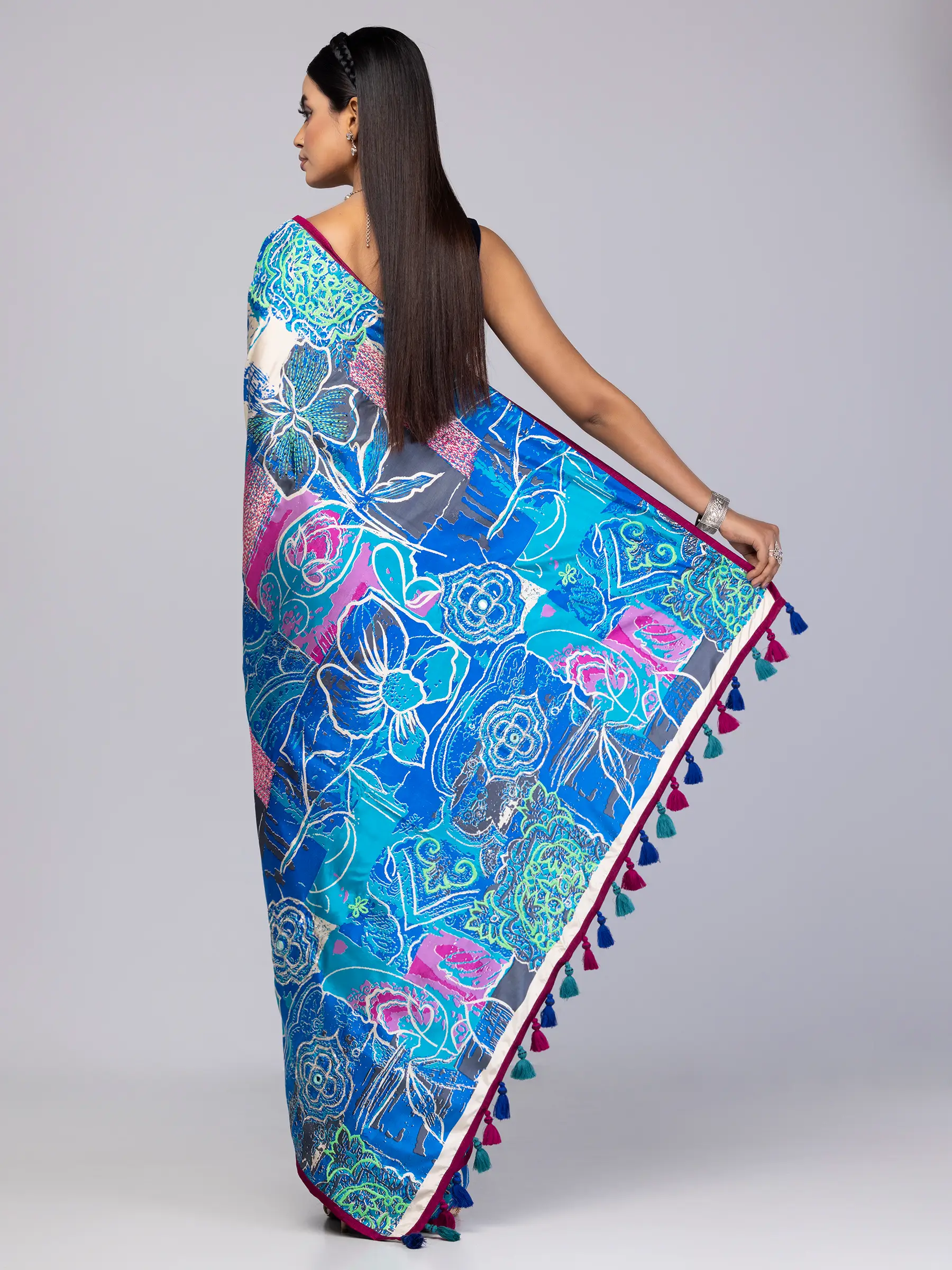 Beige/blue printed silk saree with dark pink, blue and green embroidery. Comes with matching unstitched blouse piece attached at the end of saree. Blouse shown in the photo is a styling suggestion, it is not a part of the actual product.