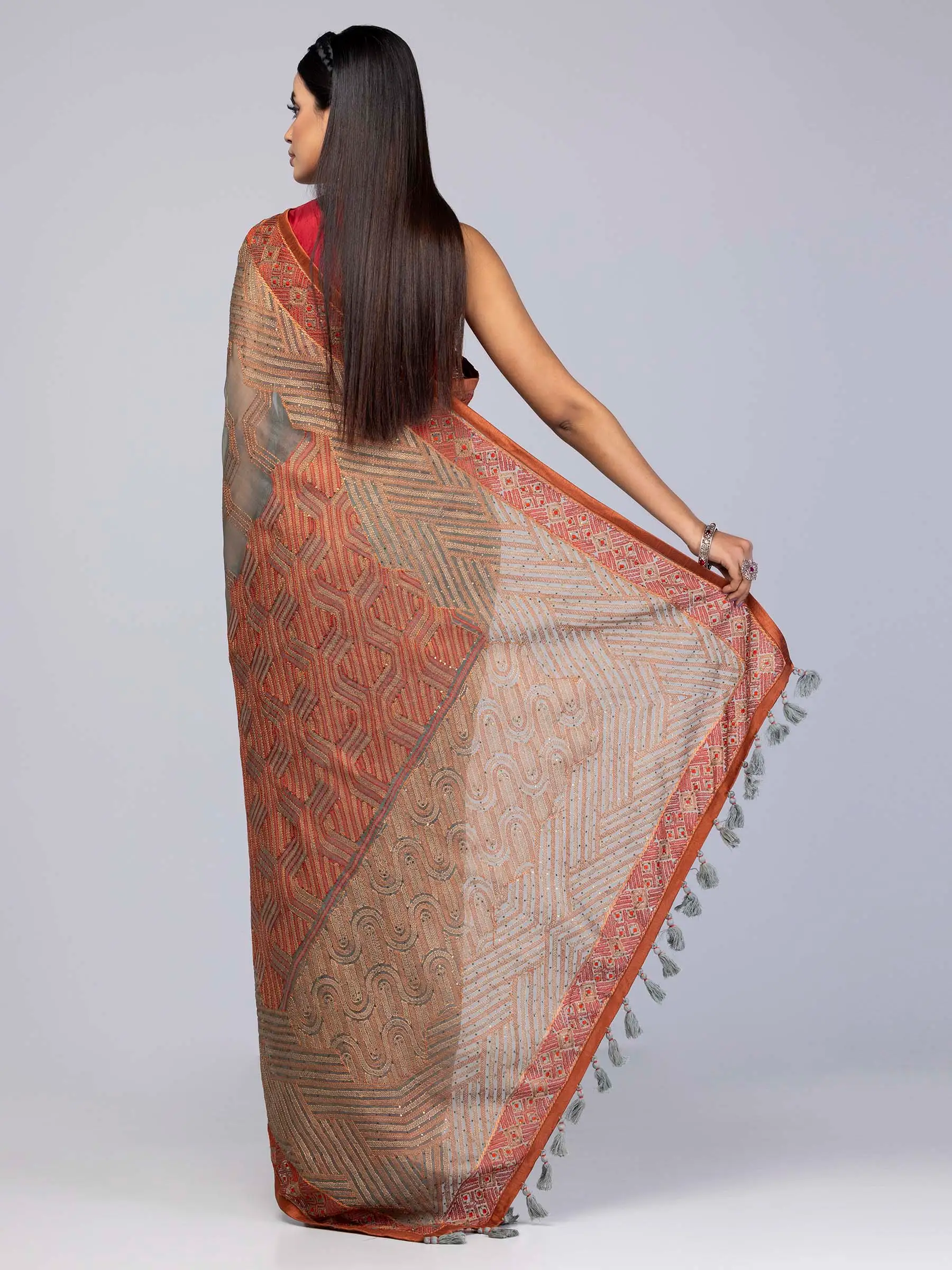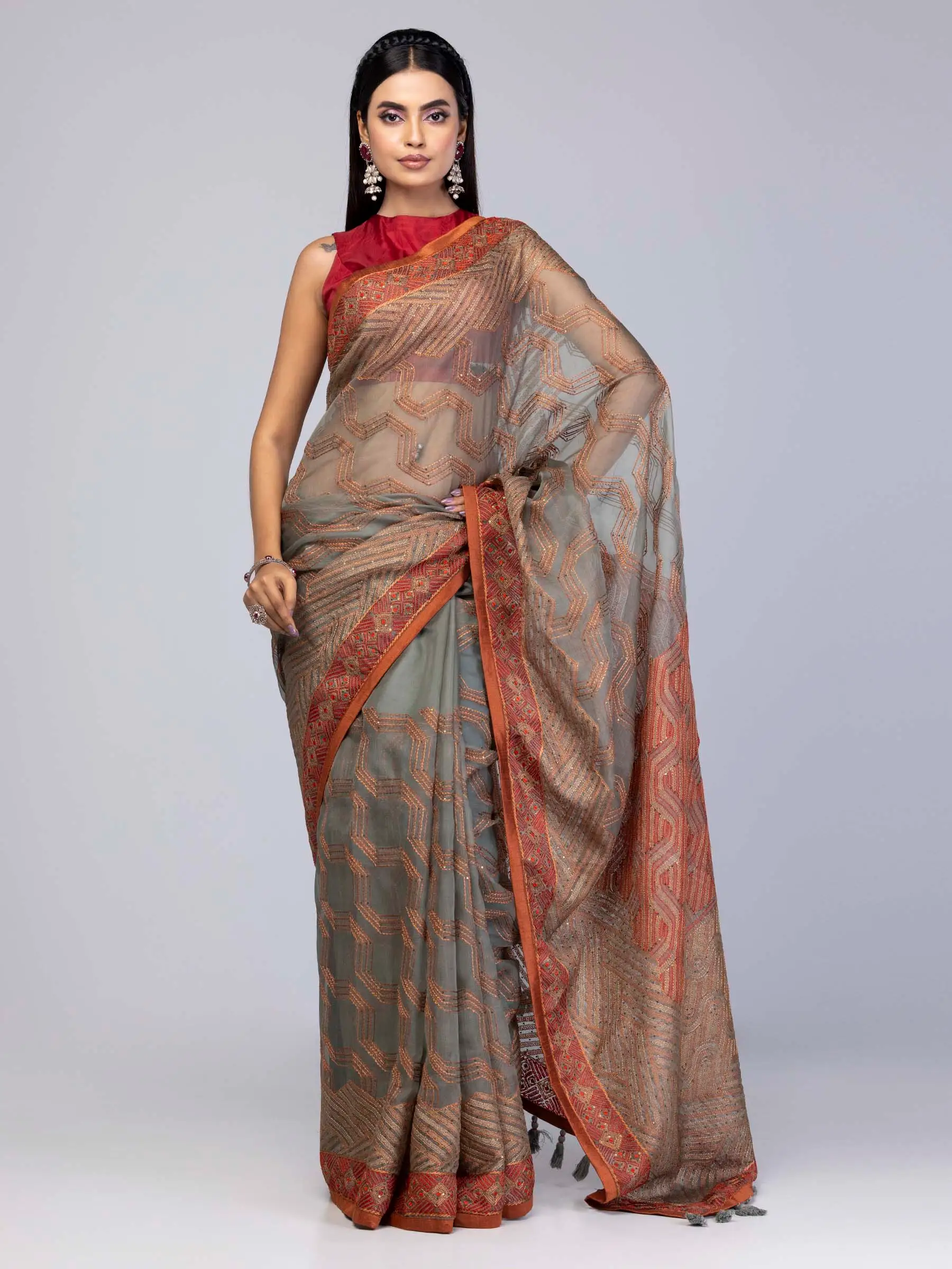 Sage green printed muslin saree with peach, beige, copper and shades of orange embroidery. Comes with matching unstitched blouse piece. Blouse shown in the photo is a styling suggestion, it is not a part of the actual product.
