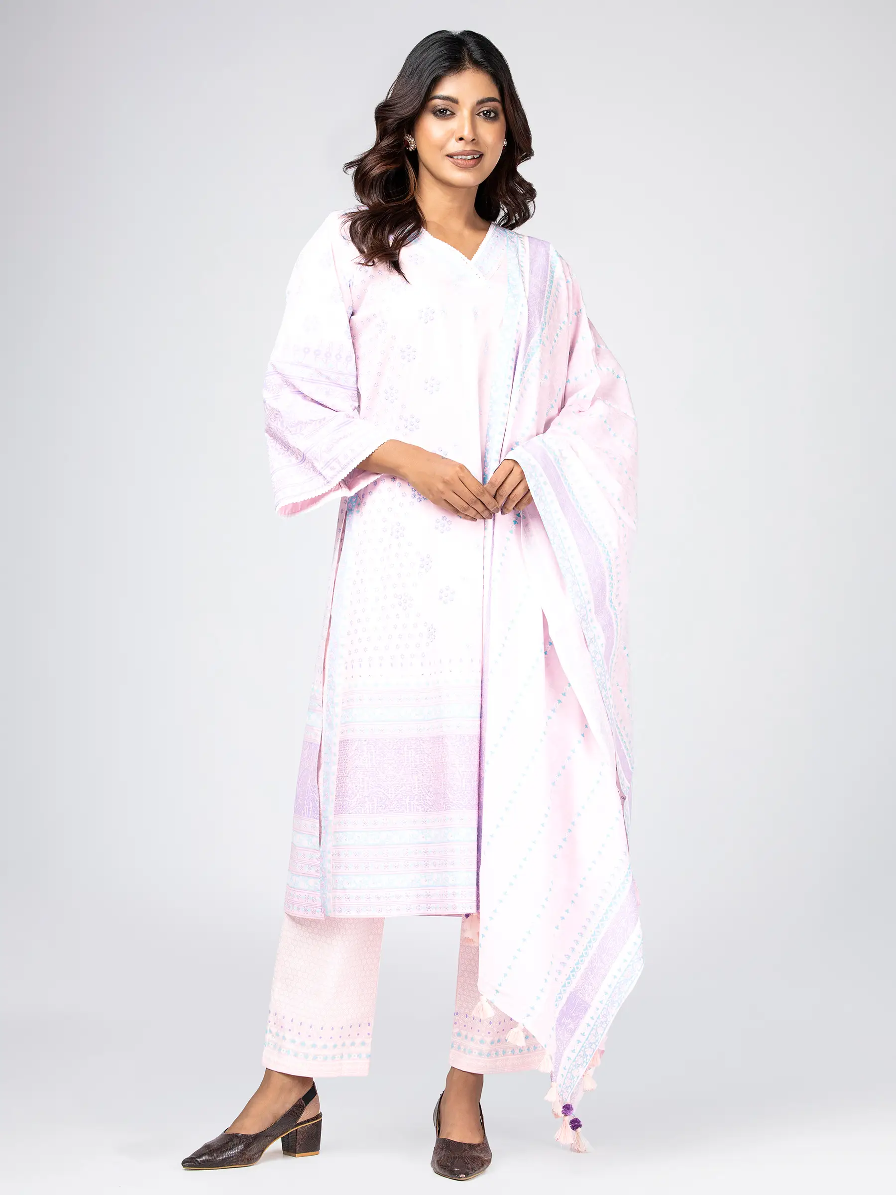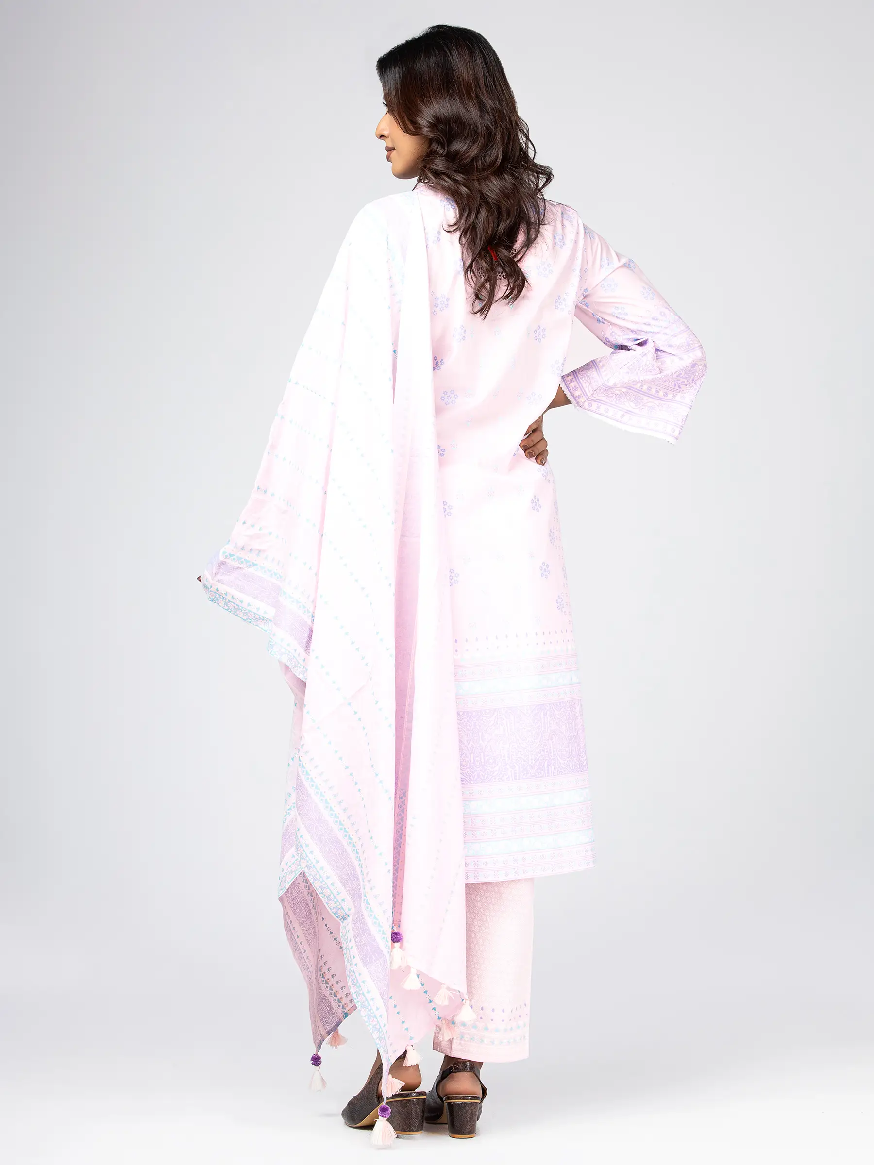 Light pink textured cotton kameez with light purple, sky blue and white prints. Features light pink embroidery and sequence work detailing. Comes with matching cotton shalwar and printed vortex-cotton dupatta.
