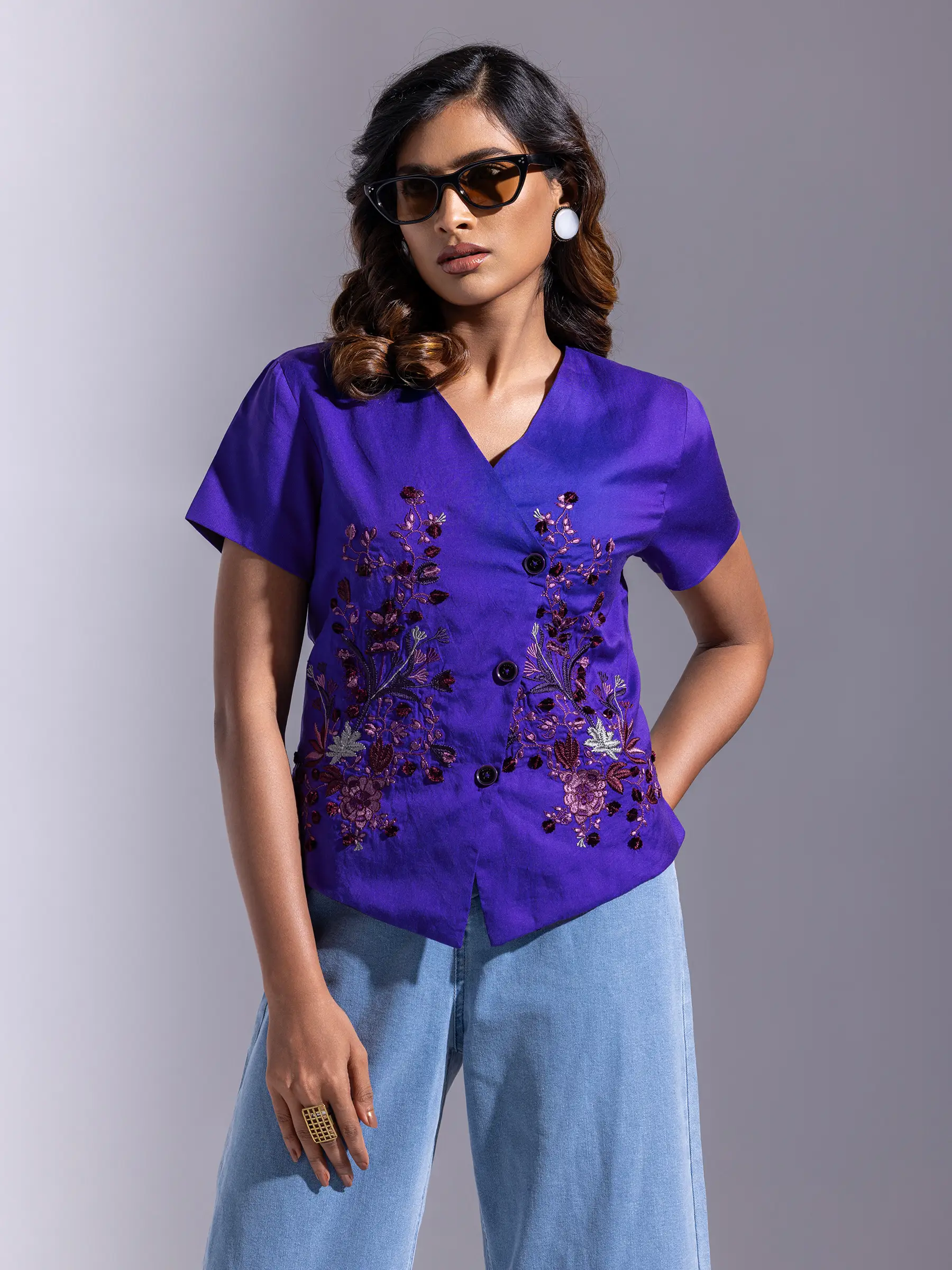 Purple Embroidered Viscose-Cotton Taaga Dressy Top