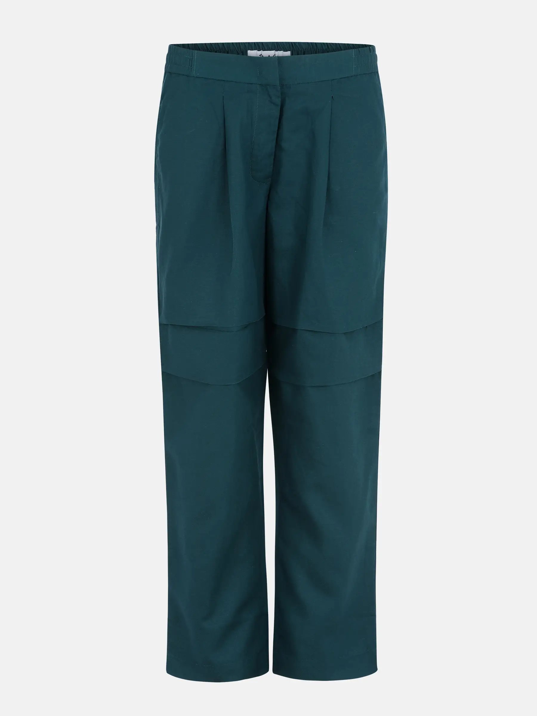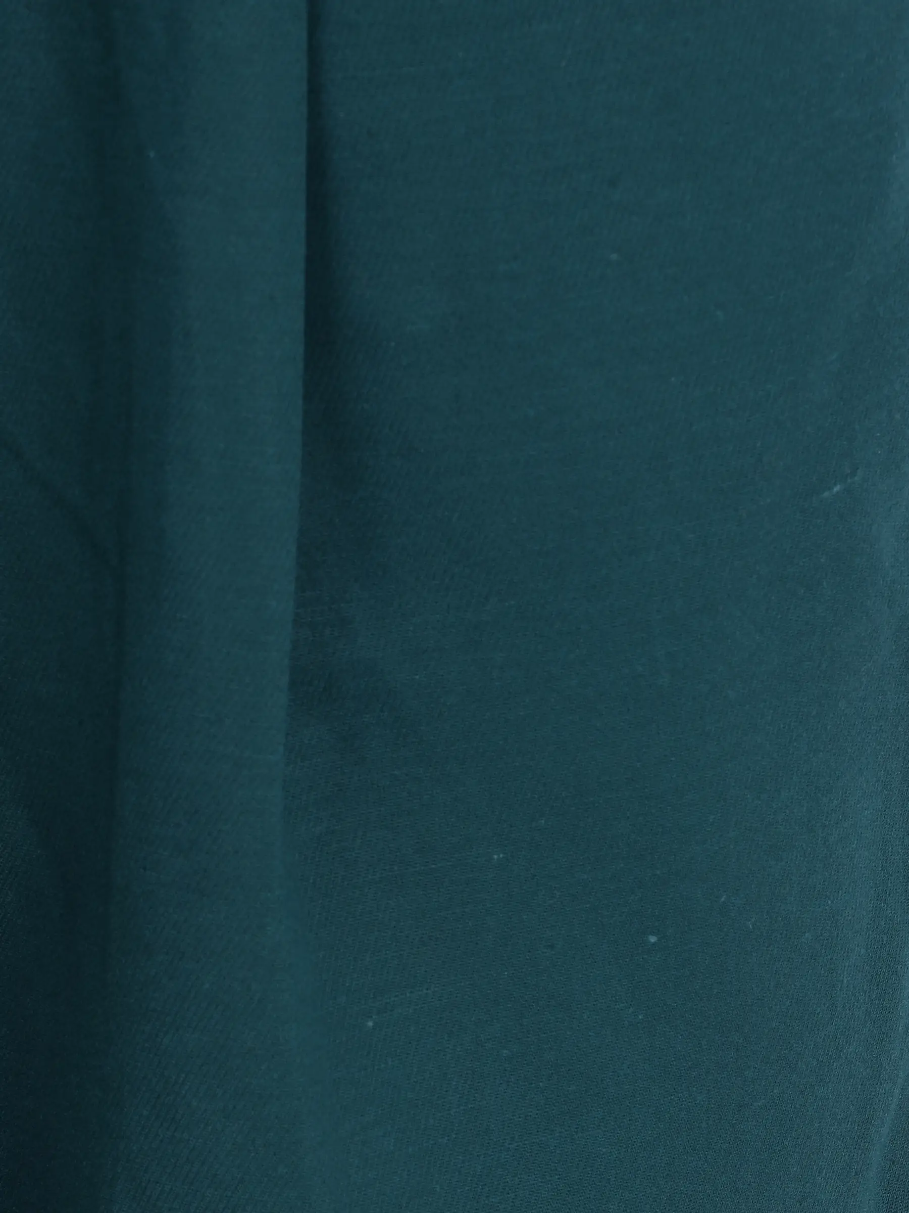 Teal mixed fabric formal pant. Features hook closure and elastic waist.
