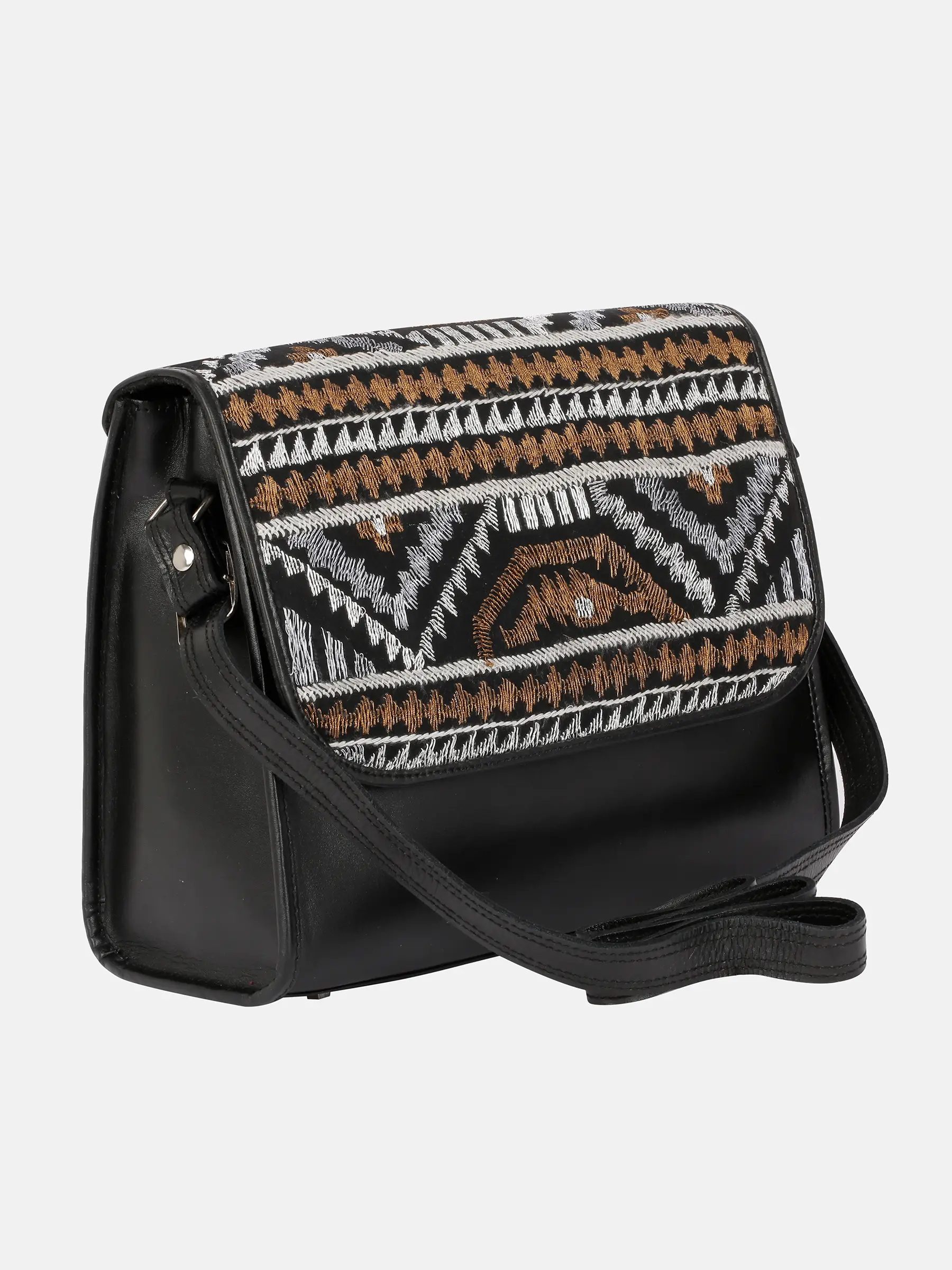 Jamdani motif embroidered black leather ladies bag.