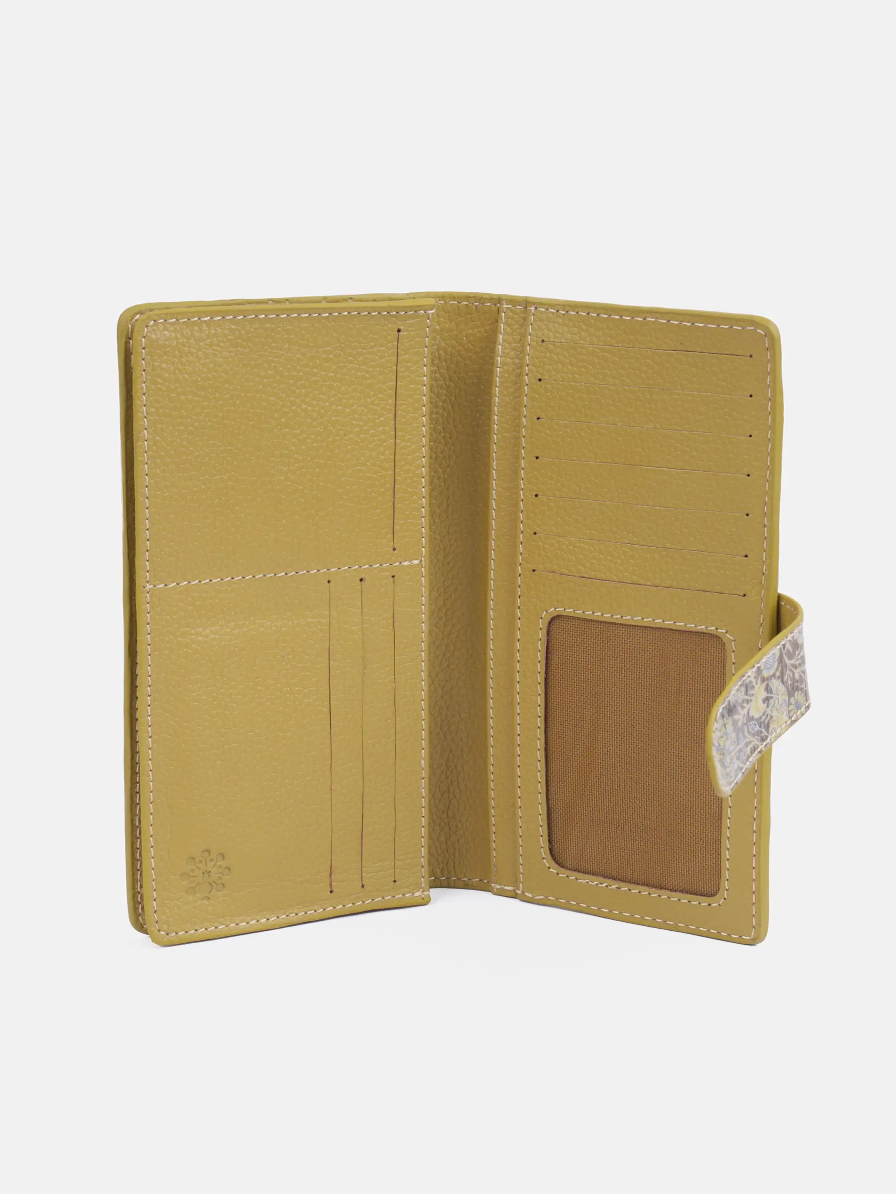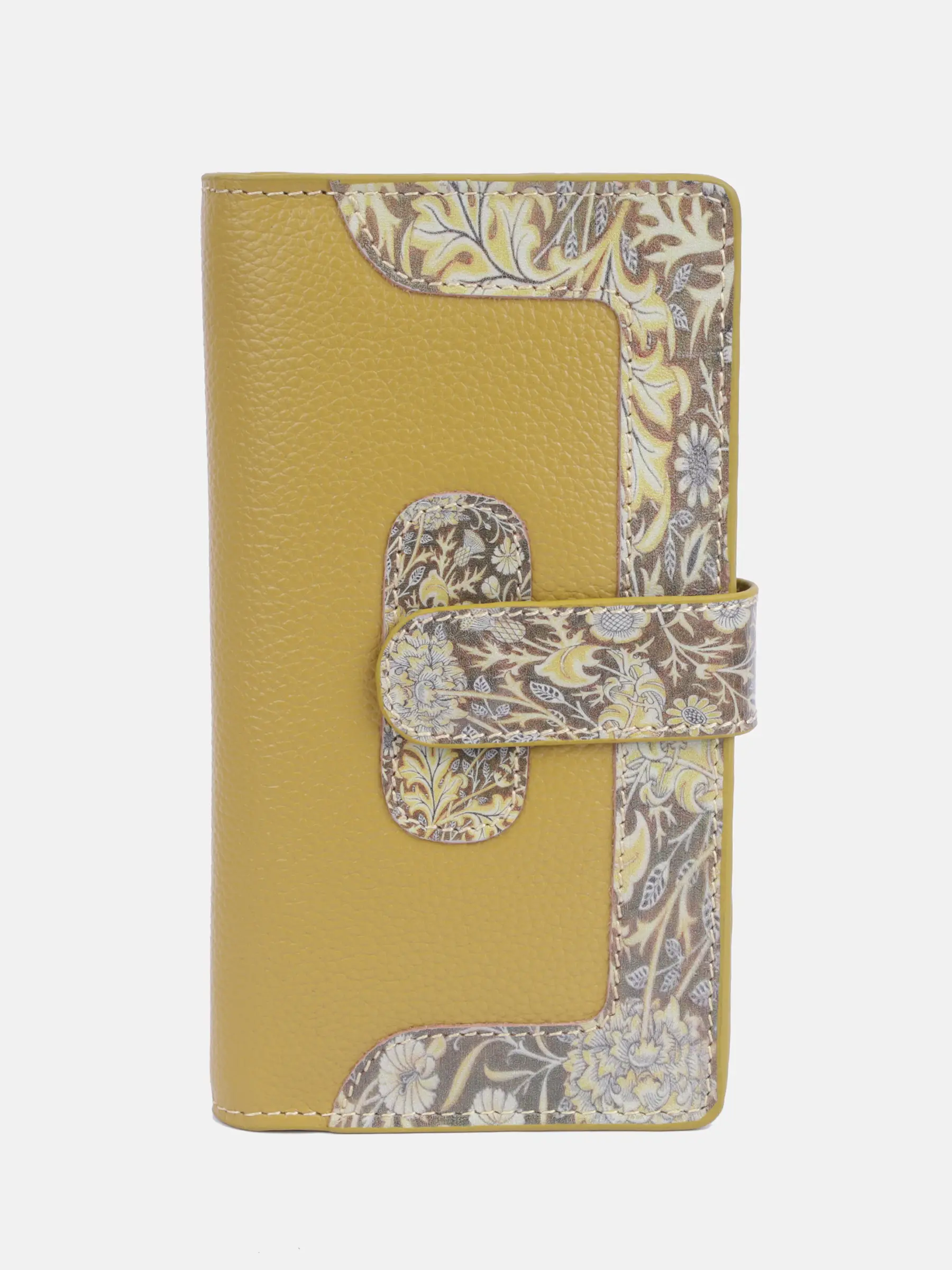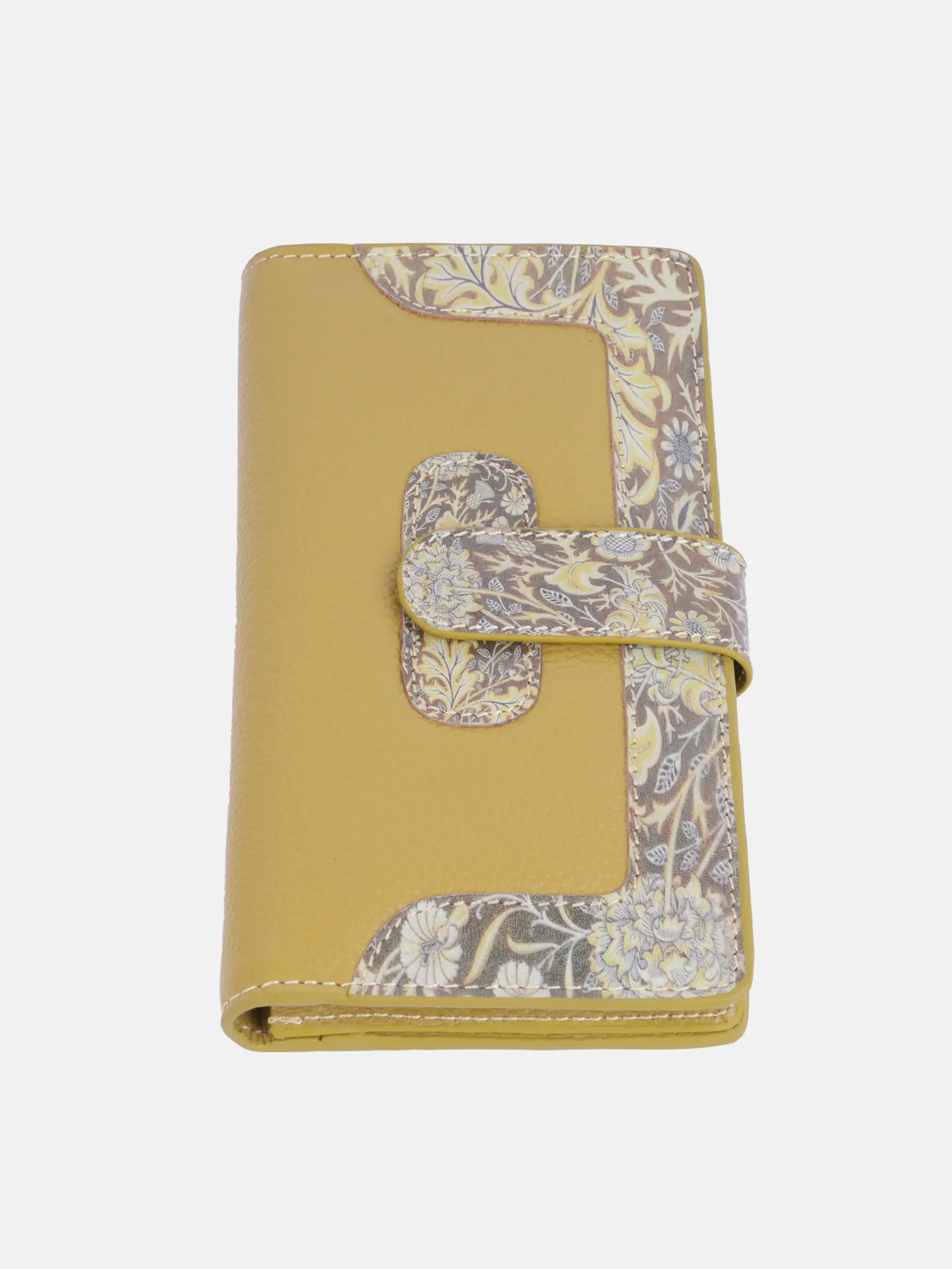 Mustard genuine leather wallet with floral prints. Features multiple chambers to keep essentials.