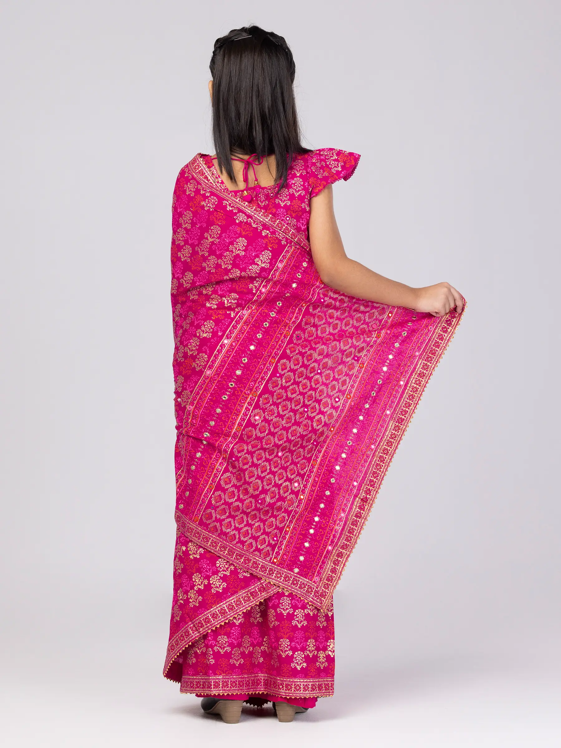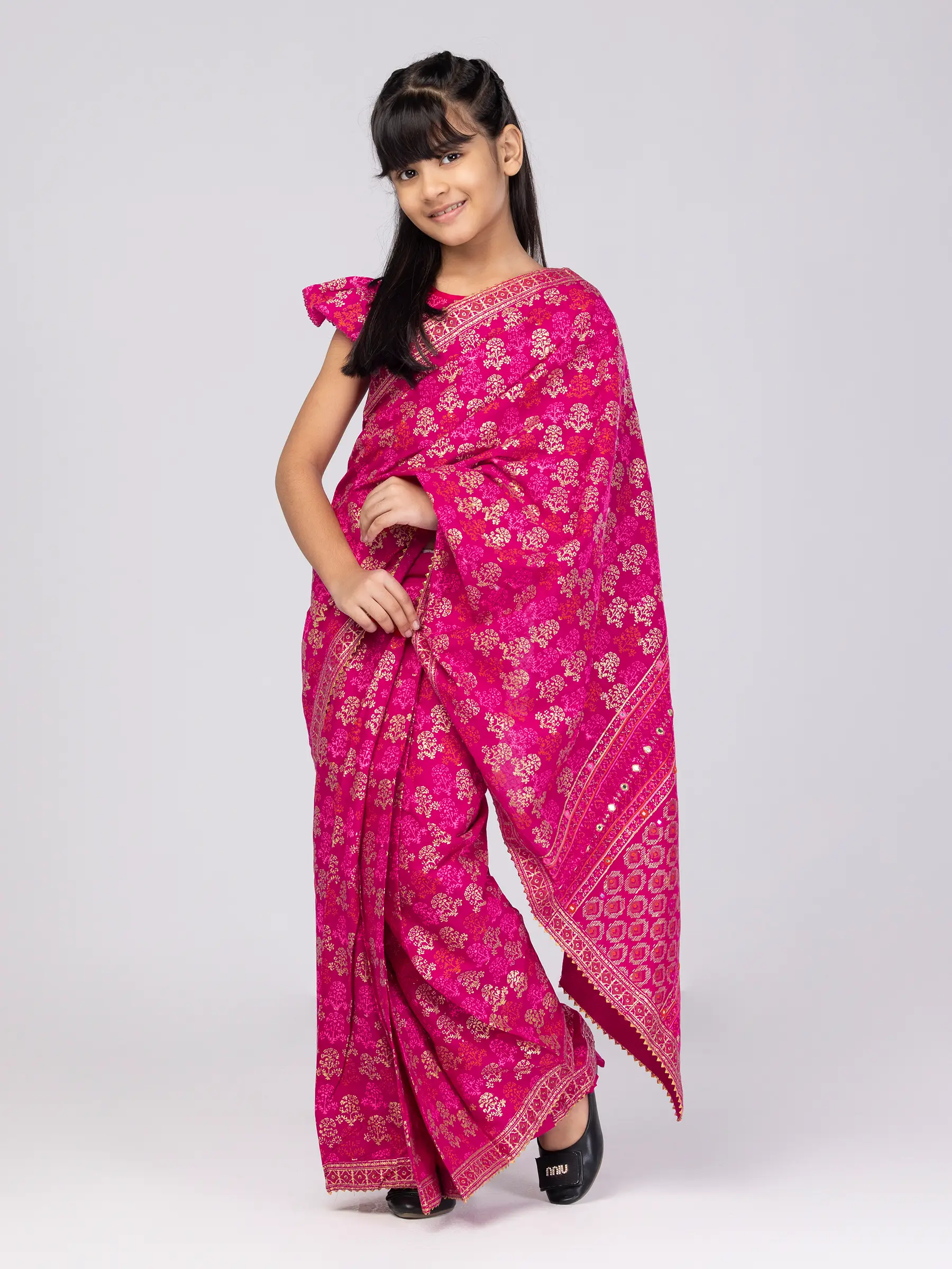 Magenta voile saree with multicolour prints and attached petticoat. Comes with matching printed voile stitched blouse.