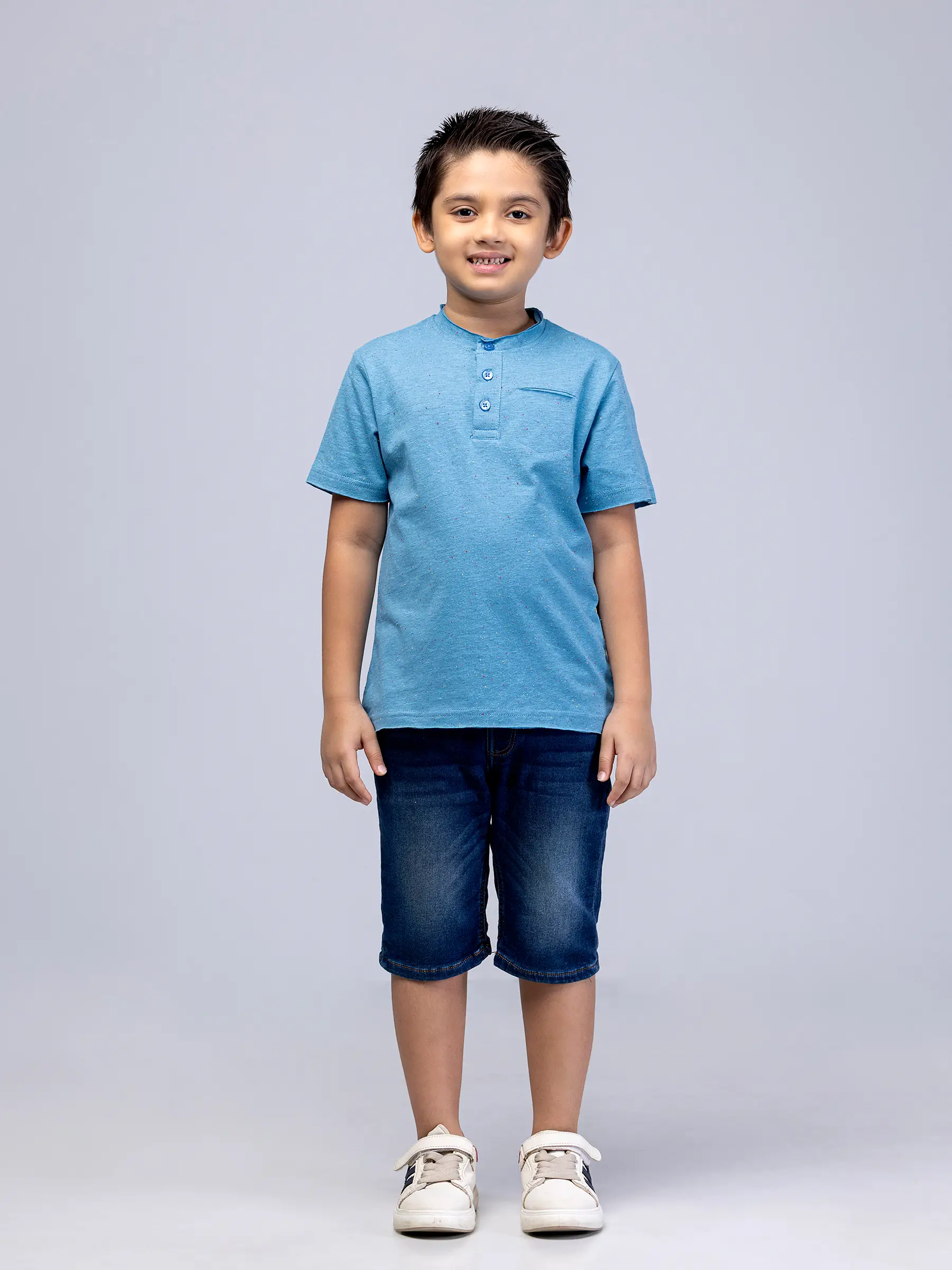 Blue single jersey knit cotton t-shirt. Features chest pocket
