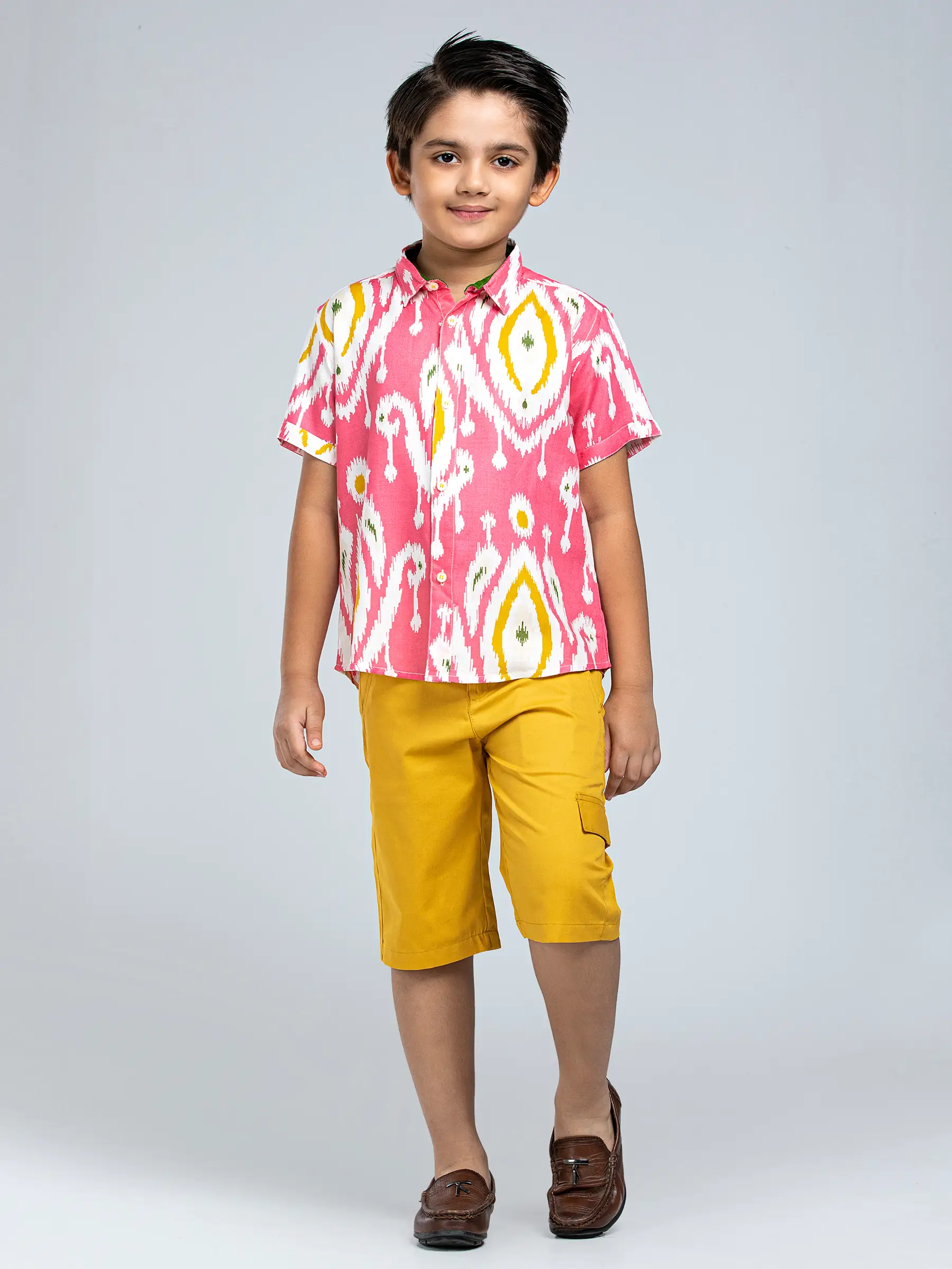 Pink cotton shirt with white, yellow, green and beige prints. Comes with yellow gabardine pant.