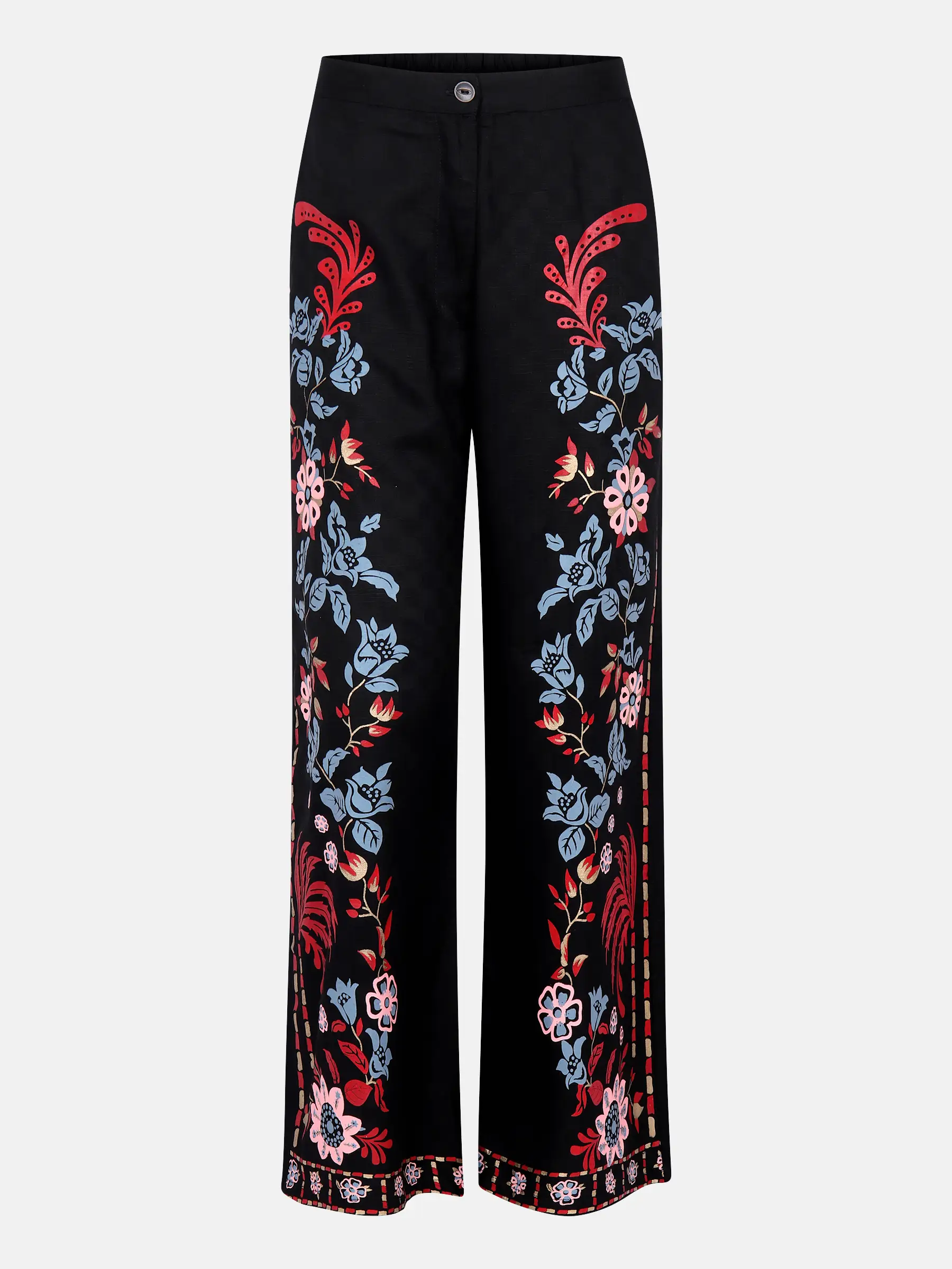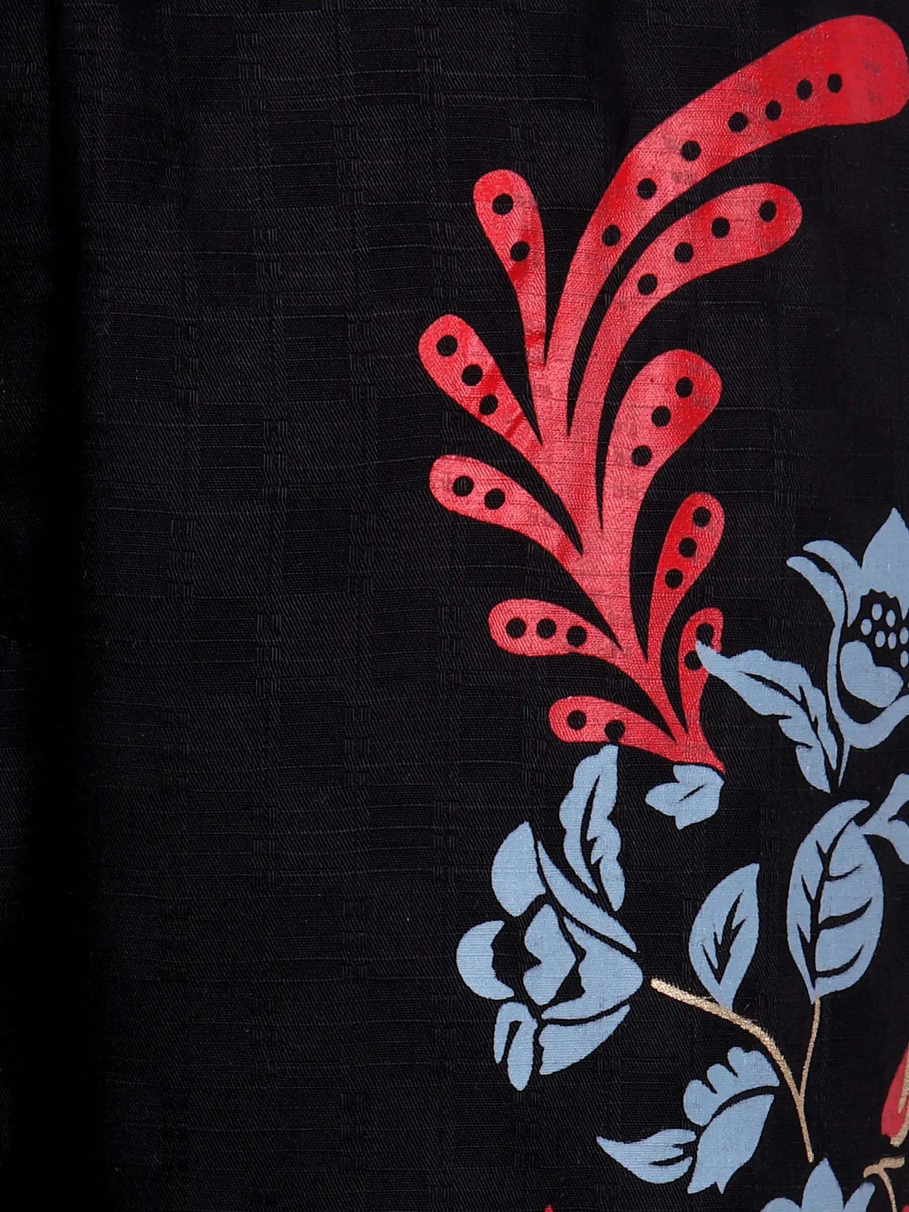Black textured cotton pant with slate blue, burnt orange, golden and light pink prints. Feature non-adjustable waist, side pockets and belt loops.