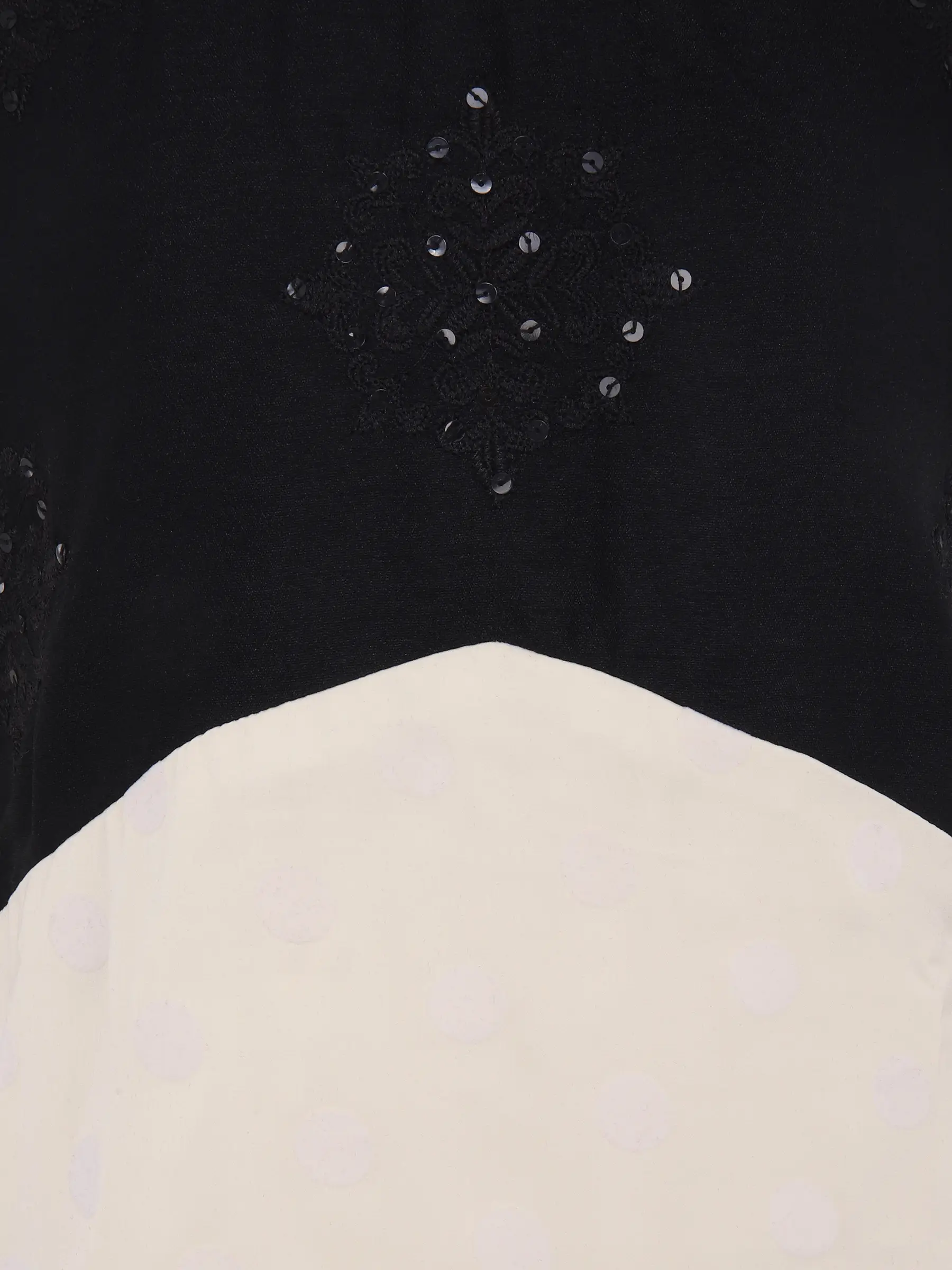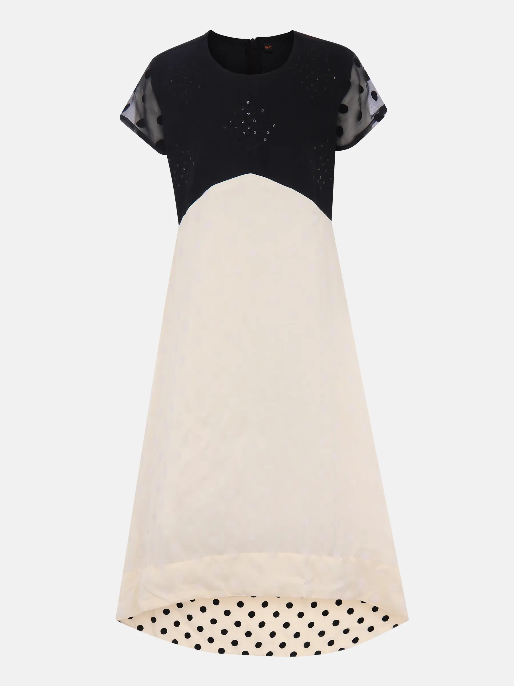 Ivory and black printed mixed cotton party frock with black embroidery. Features mixed cotton inner lining.